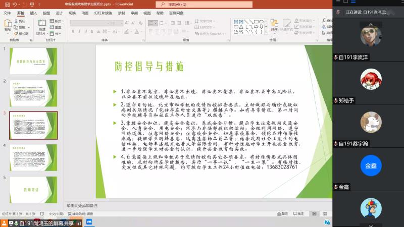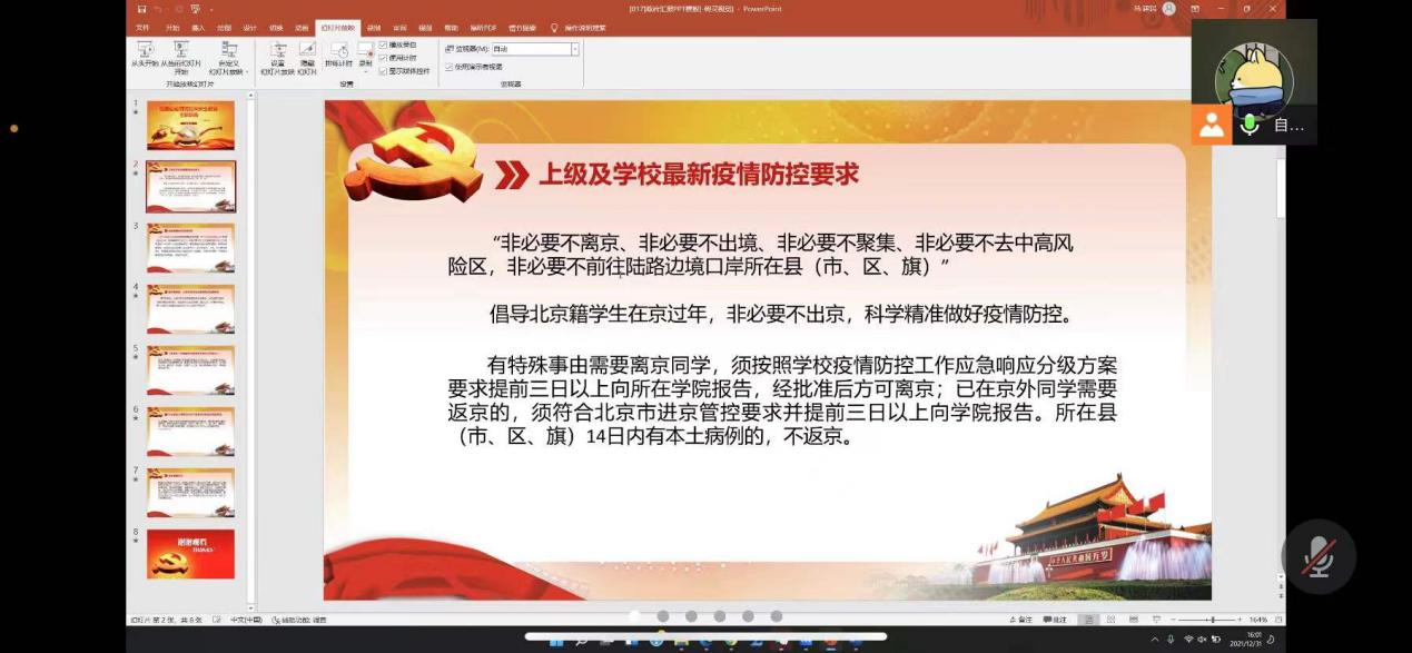 研究生班级由班长主要介绍了放假期间要主动遵守当地的防疫制度,倡导京籍学生留京过年,京外学生减少流动,就地过年;一旦有入京/出京需求,除了需要符合当地的政策还要提前三日向学校打申请;一旦出现时空交叉问题需要向当地社区和学校老师进行双汇报,有紧急的特殊问题可以拨打校内学生工作的24小时值班电话。除此之外还着重强调了寒假需要注意提高安全意识,不参与邪教组织,谨防电信诈骗等问题。辅导员胡道容老师在会议最后进行补充,通过校内发生的常见案例给予广大同学们警戒,叮嘱各位同学在假期注意自身防疫、家人防疫等问题。