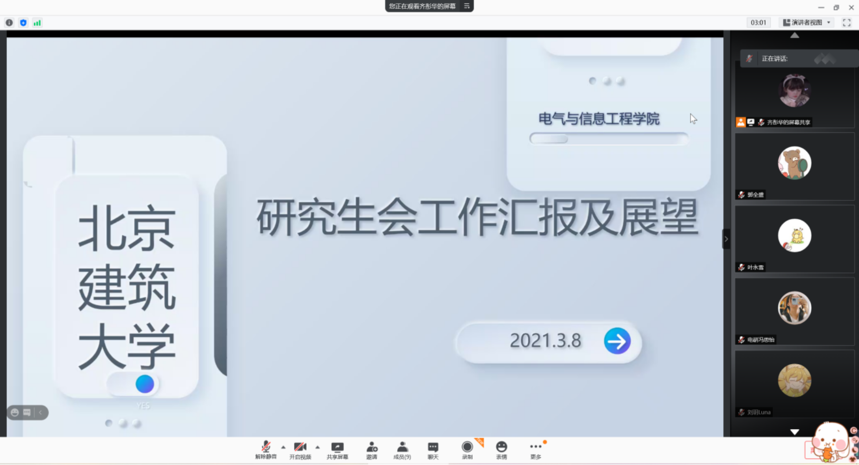 3月8日下午,电信学院研究生会新学期工作会以线上的形式顺利举行。电信学院党委副书记田芳老师、辅导员韩亚洁老师以及研会全体成员出席此次会议。