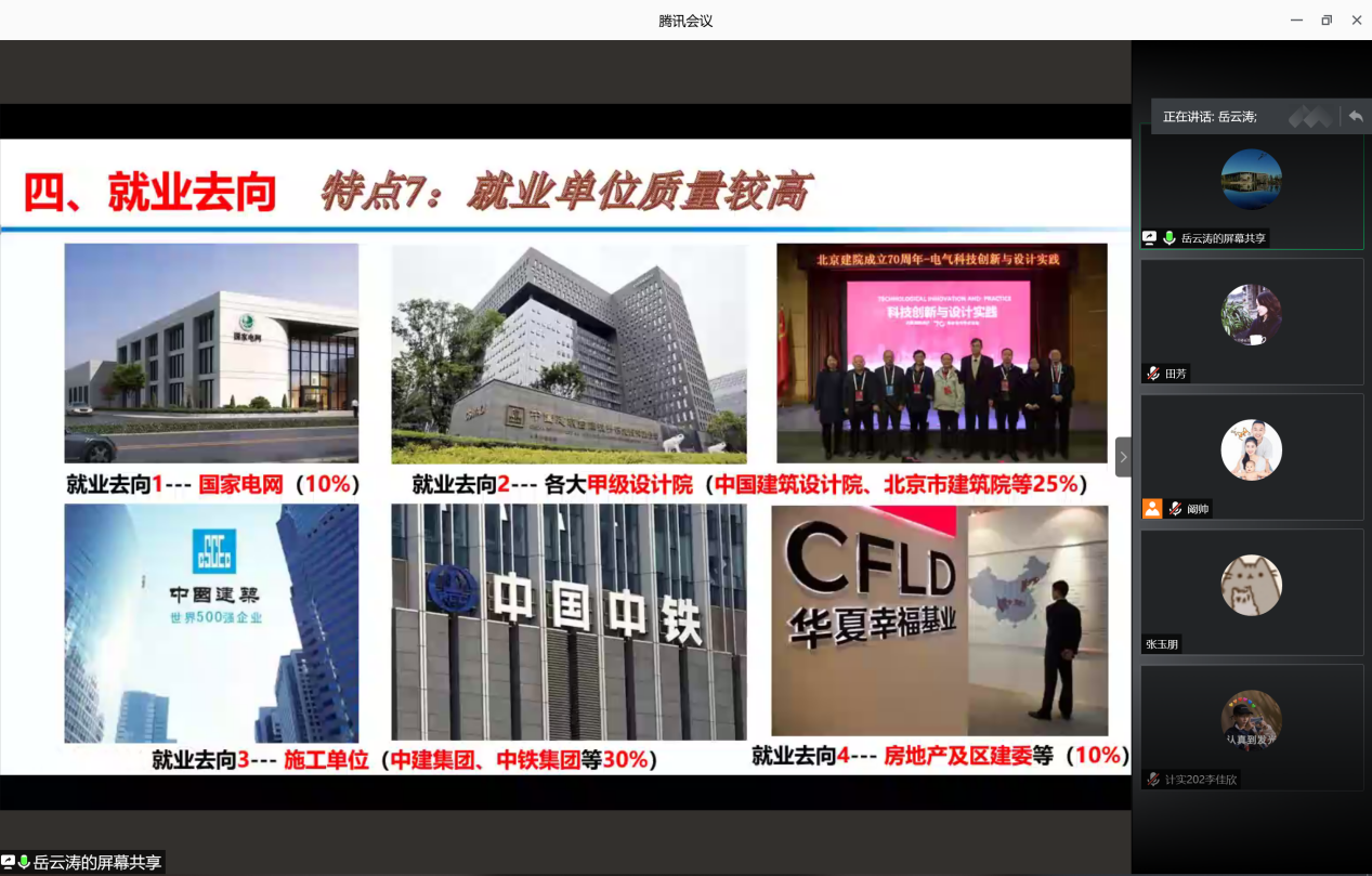 10月31日晚20:00-22:00,电信学院面向大一同学召开新生专业引航介绍会。学院党委副书记田芳、各专业负责人自动化系谭志老师、电气工程系岳云涛老师、计算机科学与技术系田乐老师、建筑电气与智能化系王晓辉老师、人工智能系田启川老师及全体2020级本科新生参加此次专业引航,会议由20级辅导员阚帅主持。