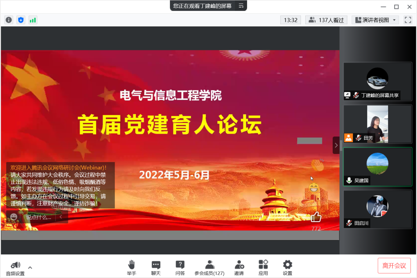 5月26日,电信学院首届党建育人论坛开幕暨首场报告开讲。学院领导班子成员、党委委员、师生共计200多人相聚线上,共同参加论坛活动,活动由党委副书记田芳主持。