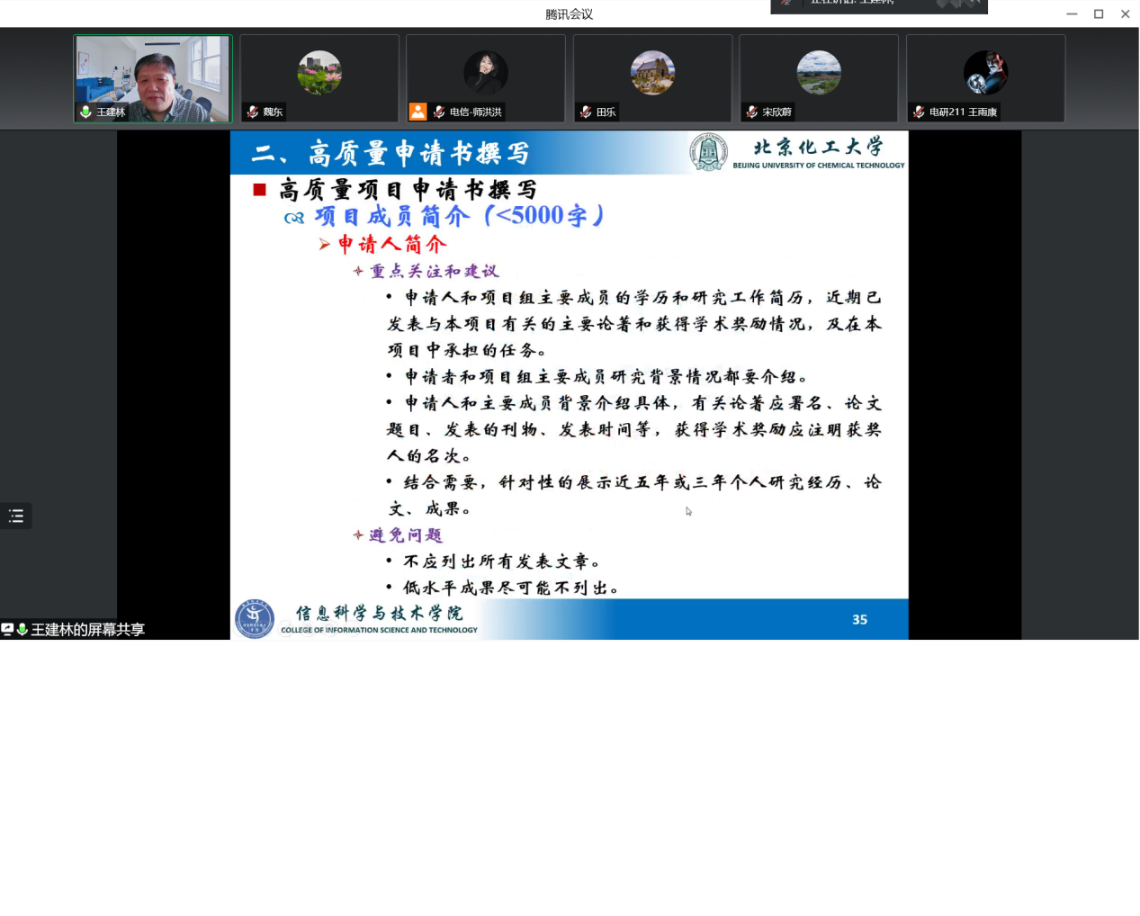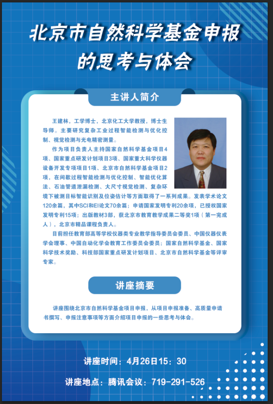 为做好2022年度北京市自然科学基金项目申报工作,进一步提高申报数量和质量,4月26日下午,电信学院以线上腾讯会议形式举办了北京市自然科学基金项目申报培训会。本次培训邀请北京化工大学博士生导师王建林教授,会议由电信学院副院长魏东教授主持,预申报项目的全校100多人教师参加了培训会。