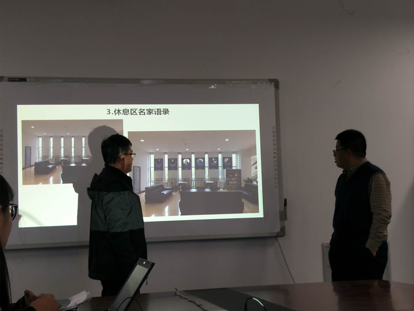 在前期广泛征求学生、教师意见,并进行多轮院训院徽征集、展览展示设计的基础上,领导小组又从文字材料编排、展板材质和样式设计、色彩纹路搭配等多个方面对各楼层设计进行了深入讨论,与会人员根据自身的看法提出了相应的意见,经过长达一个上午的讨论和修改,最终确认了优化方案和制作周期。