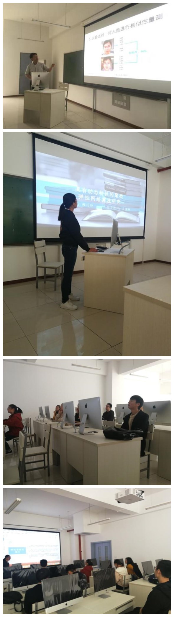 本学期城市计算与人工智能研究室也多次开展了学术交流活动。9月18日下午在大兴校区学院楼D-206实验室举办了由田启川副教授担任主讲的“人脸识别技术”学术交流报告,田老师分别从人脸识别技术相关的概念、应用领域、识别方法、项目开发及应用演示等几个方面深入浅出地进行了介绍,并指出“人脸活体(FaceLiveness)”是一个将用户交互和算法紧密结合的问题解法,目前人脸识别技术已应用于信息安全、物理安全、刑侦监控、影视娱乐、视频智能审核等多个领域当中。随着科学技术的发展,主流的人脸识别方法与深度学习相结合,人脸识别技术在各项子任务中不断刷新人工智能算法的世界纪录。另外,田老师还介绍了基于深度学习图像识别技术的PaddlePaddle与TensorFlow平台,为同学们指明了图像识别技术的学习方向。10月30日下午,衣俊艳老师的研究生雍巧玲同学做了“具有动态特性的聚类弹性网络算法研究”学术交流报告。雍巧玲同学首先介绍了为应对当前人类急需将大量多维的数据进行快速有效的处理分析的现状,并指出相关研究具有重要意义,然后分别从算法原理、聚类过程、算法改进、实验结果等几方面介绍了该项研究的具体内容,通过对仿真结果进行了分析。两场讲座气氛热烈,互动频繁,精彩之处不时响起热烈的掌声。