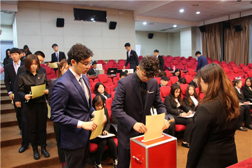 学生会副主席郑浩宣读总监票人、监票人、计票人名单。分别表决通过团代会和学代会监票人、计票人名单后,由双代会总监票人耿金骁主持选举并宣读注意事项。