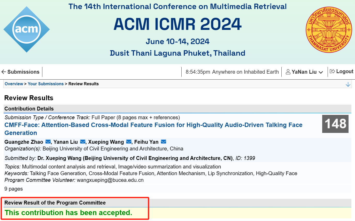 2024年4月7日,在赵光哲教授和王雪平讲师的指导下,雏鸟app 电信学院研究生刘亚楠的论文CMFF-Face: Attention-Based Cross-Modal Feature Fusion for High-Quality Audio-Driven Talking Face Generation在第14届多媒体检索国际会议(The 14th International Conference on Multimedia Retrieval)中被接收。该论文主要研究内容是基于音频驱动的说话人脸生成。论文作者为赵光哲、刘亚楠、王雪平(通信作者)和闫飞虎,作者单位均为雏鸟app 。