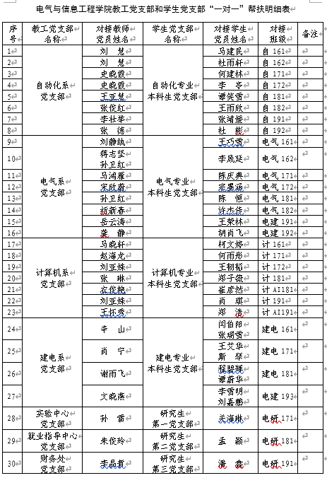 学院5个教职工党支部和机关处室2个党支部(就业指导中心党支部、财务处党支部)采取一对一形式联系全院本科生和研究生党支部,同步辐射延伸到学生党支部所对应的30个班级。同时,学院要求各党支部指派专人进行“一对一”对接,将任务明晰、将责任到人。目前,所有支部与班级已对接完成。