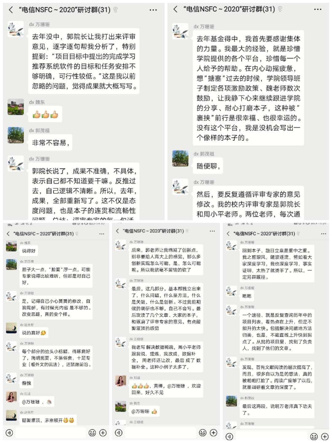 疫情防控期间,为确保电气与信息工程学院国家自然科学基金申报工作的顺利进行,学院提前布局谋划,加强摸底调研,组建“电信NSFC-2020”专项工作群来发布最新指南、交流申报书撰写经验、在线解答教师疑惑,并聘请校内外专家重点把关、定期组织申报教师进行申报工作线上推进。3月5日晚,在院长郭茂祖、副院长魏东精心安排下,邀请上一年度获批青年基金项目的万珊珊老师在线分享撰写经验。