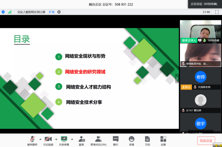 为增强师生国家安全意识,加强国家安全教育,在第五个“全民国家安全教育日”来临之际,电信学院将国家安全教育融入学生专业教育,两手抓两促进。2020年4月14日14点,电信学院邀请360网络安全大学安全研究员孙伟峰,作题为“大安全视角下的网络安全技术”的主题讲座。讲座通过腾讯会议和虎牙直播进行,保卫处处长牛磊、电信学院党委书记张雷、文法学院党委书记刘国朝,电信学院教师、辅导员和相关专业本科生400余人,文法学院部分教工党员参加讲座。讲座由电信学院党委副书记关海琳主持。