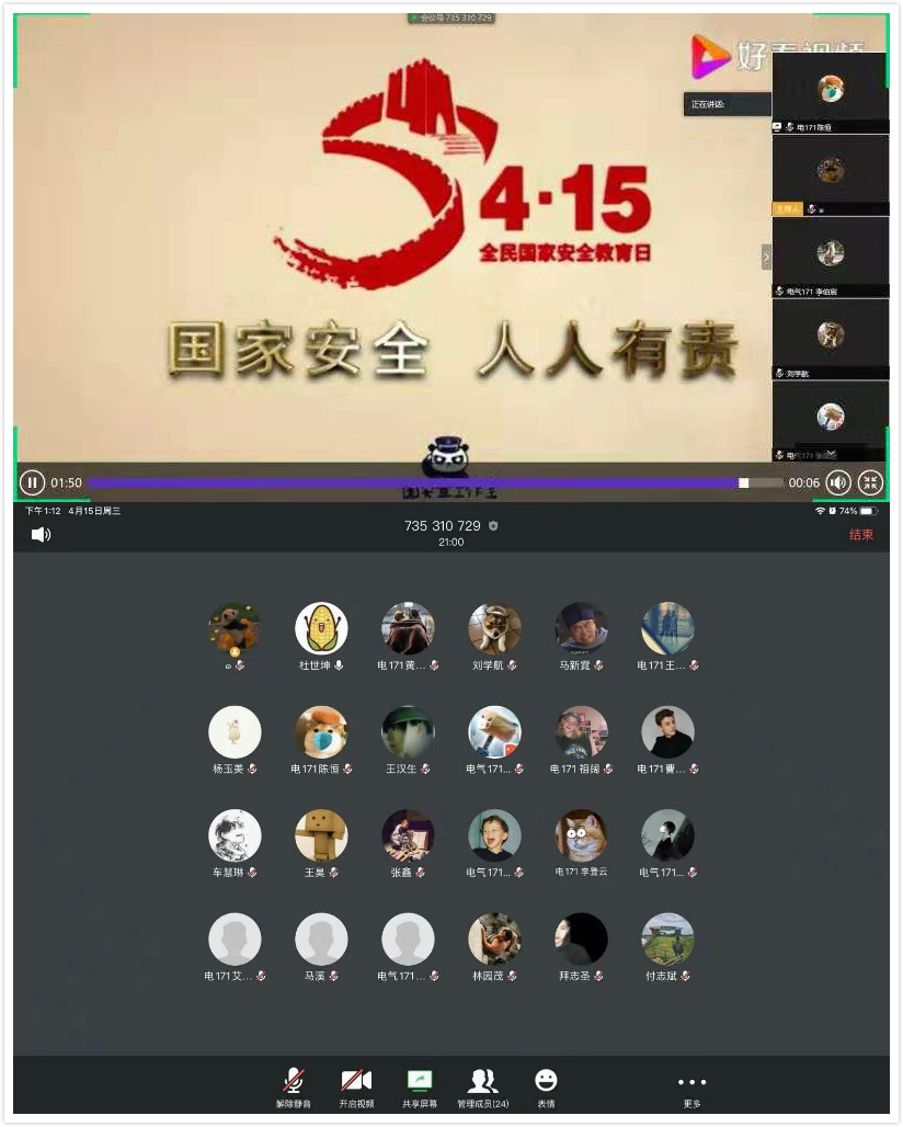 在此次活动中,电信学院各团支部充分利用网络资源在团日活动上观看全民国家安全教育日宣传视频,集中学习《国家安全法》、《反间谍法》、《反恐怖主义》、《网络安全法》等法律法规,并以多种形式开展内容丰富的线上活动。