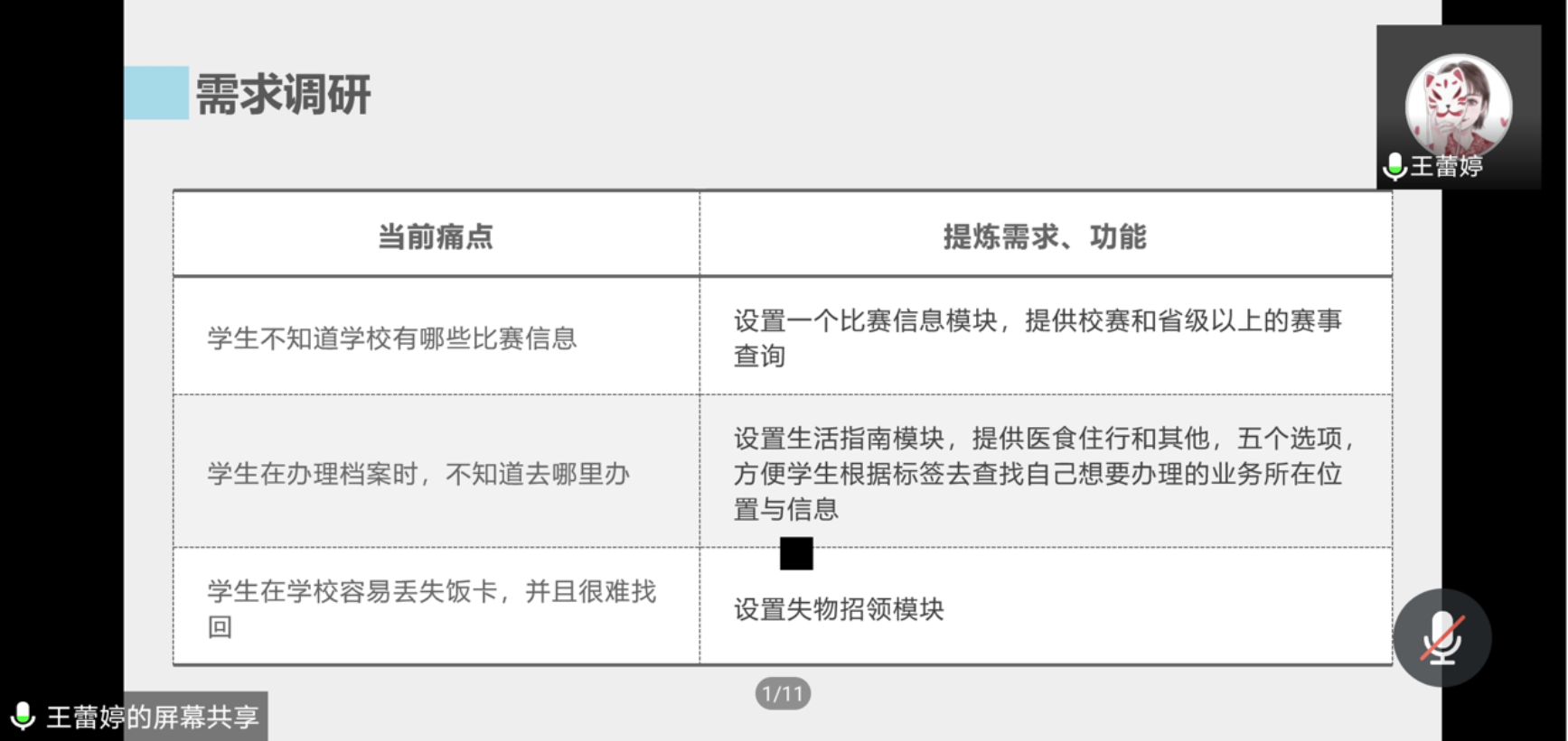 本次线上答辩交流会的形式:每小组5至10分钟左右的展示时间,形式不限,要求展现出本小组的设计思路以及产品原型即可。展示完毕后,各位评委老师以及感兴趣的同学提出问题,由小组同学进行答辩。