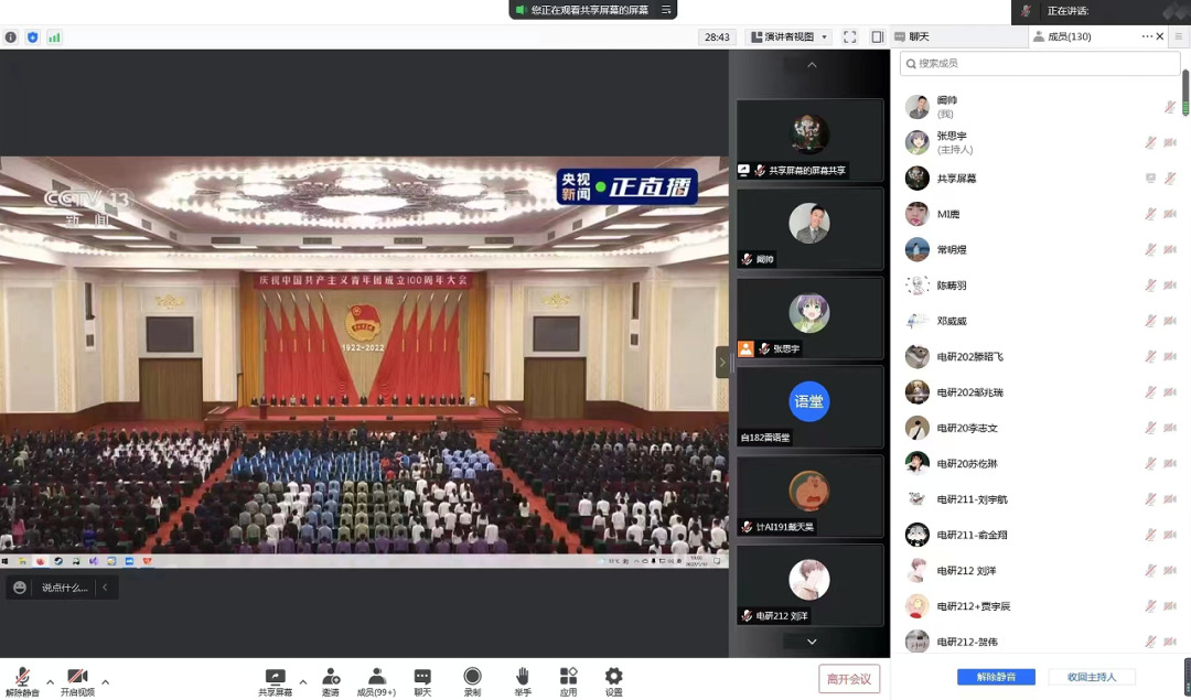 电信学院组织团员青年线上收看大会直播,并在会后第一时间组织集体学习,学院本研各年级团员代表130余人参加线上学习会。