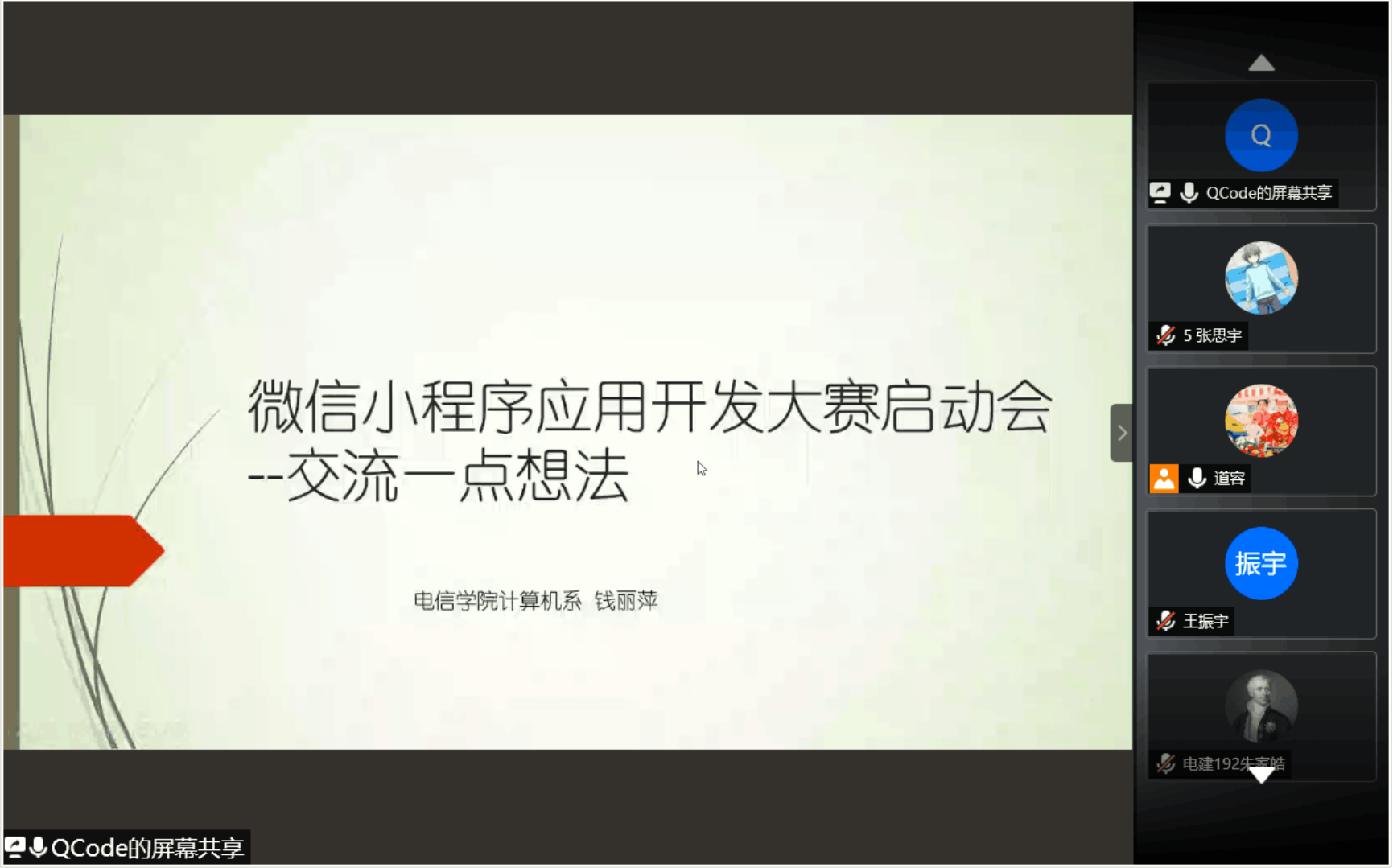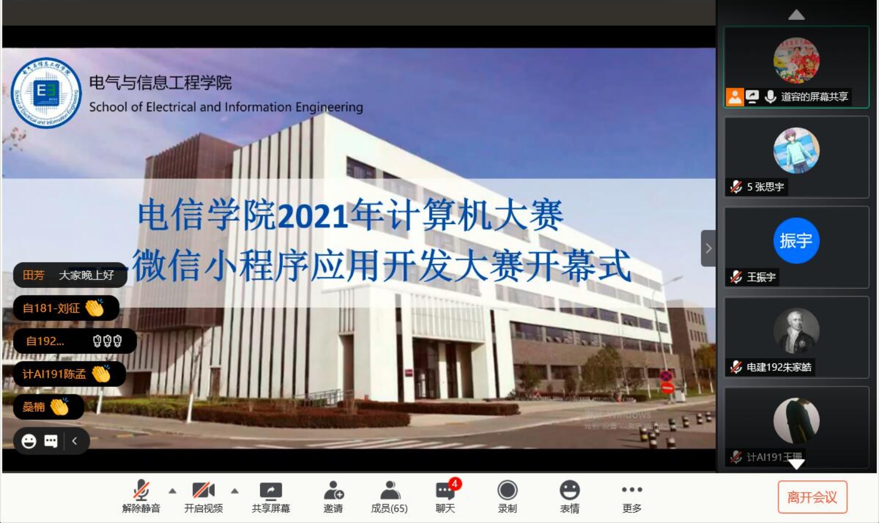 2021年1月16日,电信学院微信小程序应用开发大赛开幕式在线上成功举行。学院党委副书记田芳、团委书记阚帅、计算机专业老师钱丽萍出席本次开幕式,开幕式由电信学院2019级辅导员胡道容老师主持。开幕式围绕赛事背景介绍、学院寄语、专业教师动员、经验分享、竞赛规则解读五个方面开展。