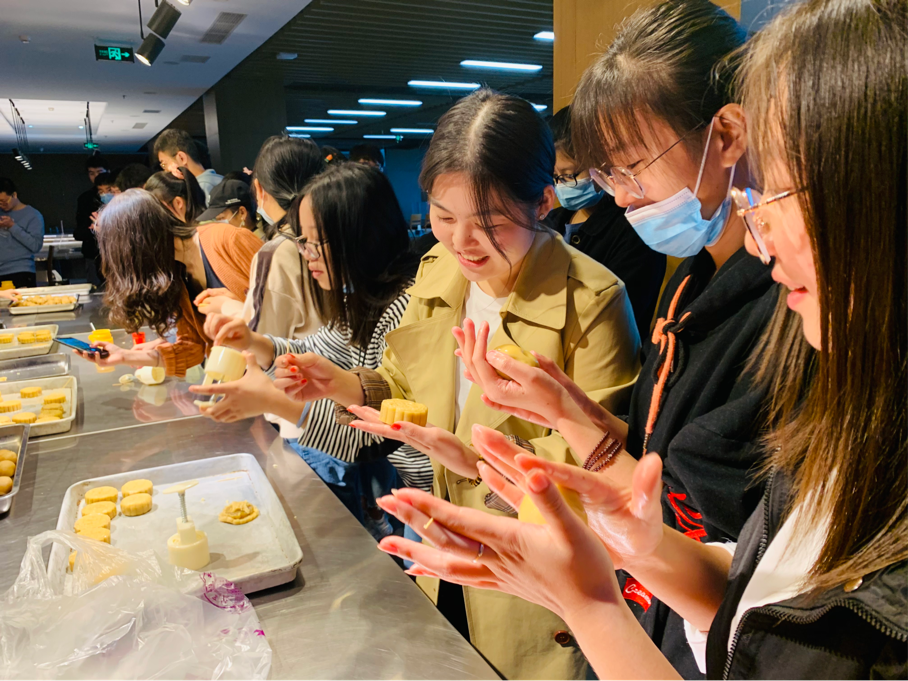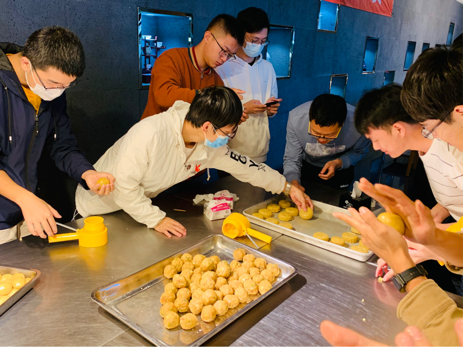 在揉制过程中,同学们洋溢着灿烂的笑容,还有被自己稚拙的手艺逗乐的,但是经过不断尝试,终于做出了专属于自己的月饼。随着月饼被送入烤箱,同学们都期待着自己的月饼出炉。最后,一盘盘月饼滚烫出炉,同学和老师纷纷寻找着带有标记的月饼。