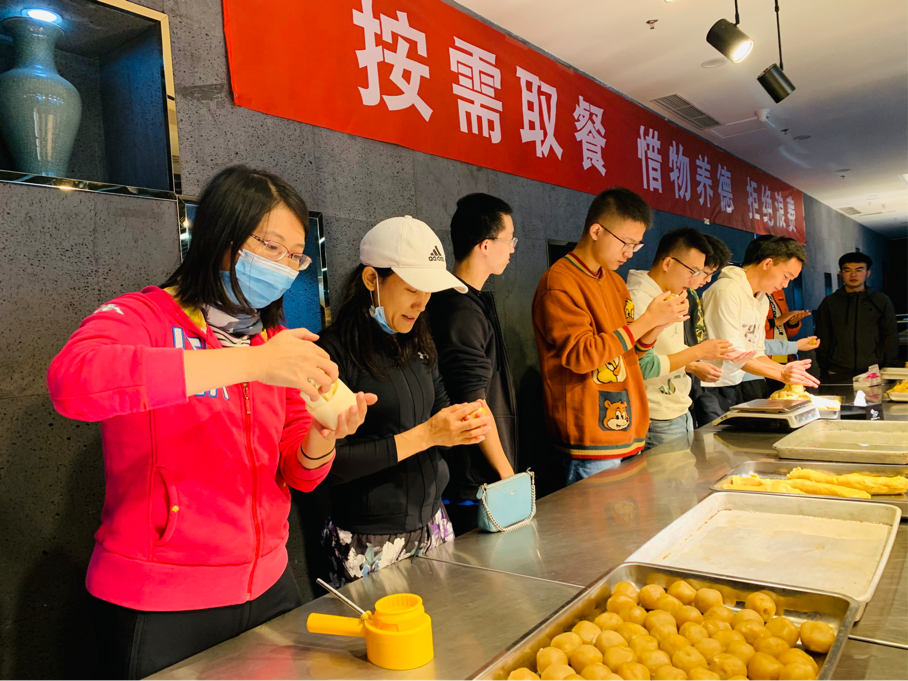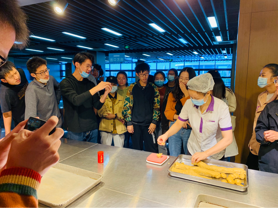 最激动的一刻来了,大家一同走到制作台前,听取食堂工作人员的讲解。随后,大家挥舞双手,跃跃欲试。在第一次压模后,有的成功了,有的不巧,压扁了,只得重新来过。