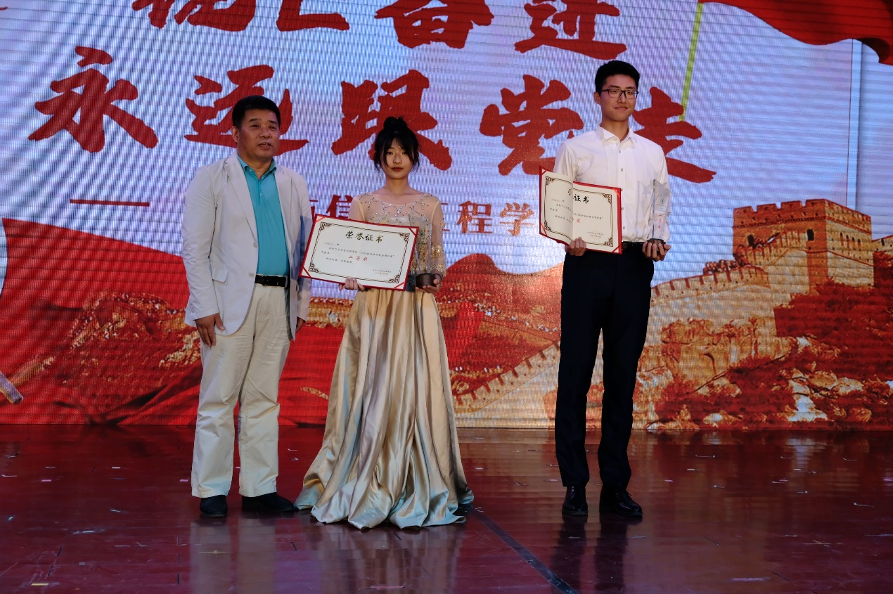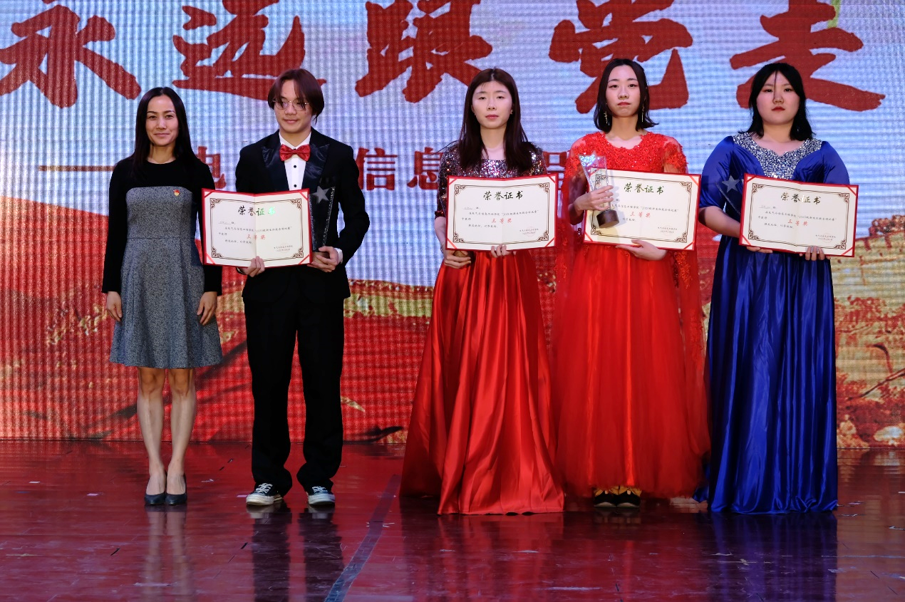 晚会终章,为合唱比赛的获奖班级颁奖。学校党委常委、纪委书记黄京红为一等奖获奖班级自电202班颁奖;电信学院院长郭茂祖为二等奖获奖班级自电203班和建电201班颁奖,电信学院党委副书记田芳为三等奖自电201班、自电204班、计实201班和计实202班颁奖。