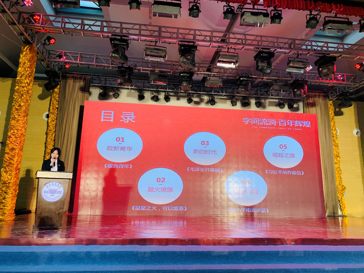 晚会由2017级学生党员谭笑雪的微党课展示拉开序幕——《字间流淌▪百年辉煌》,以《敬告青年》、《星星之火,可以燎原》、《毛泽东开幕词》、《邓小平南巡讲话》、《习近平所作报告》五篇文章出发,为大家讲述它们及其背后的党史背景,全面介绍了中国共产党建党一百年的峥嵘岁月。