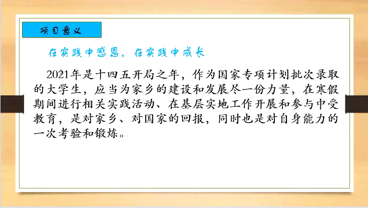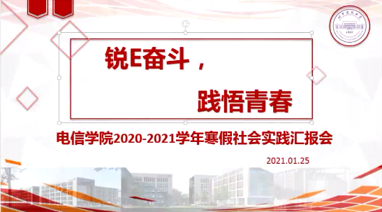 “锐E奋斗,践悟青春”主题寒假社会实践,采取“属地实践、远程协同、线上线下共同联动”的形式开展,本次实践活动共有四个主题:巩固脱贫攻 坚,心系家乡建设;记录改革变化,助力家乡发展;深入基层探访,把握社会动向;主动服务社区,强化社会责任。此次实践活动包立项6支团队,除了包含学院所提供的主题之外,还增加了丰富学生寒假文化生活足不出户游北京——数字博物馆线上参观团和献礼建党100周年的汇往昔峥嵘记忆,向建党百年献礼团队。