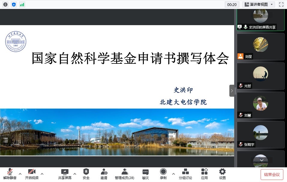 学院史洪印教授从选题、立项依据和意义、研究内容、关键科学问题等方面分享了基金撰写与申请中的一些体会。他强调创新性是基金申请成败的基础,认真撰写是申请成败的关键,要从已有基础中“抽丝剥茧”,提炼出足够说服评审专家的核心创新点,并建议大家认真打磨申报书,注意每一处细节,提前谋划,稳步推进。