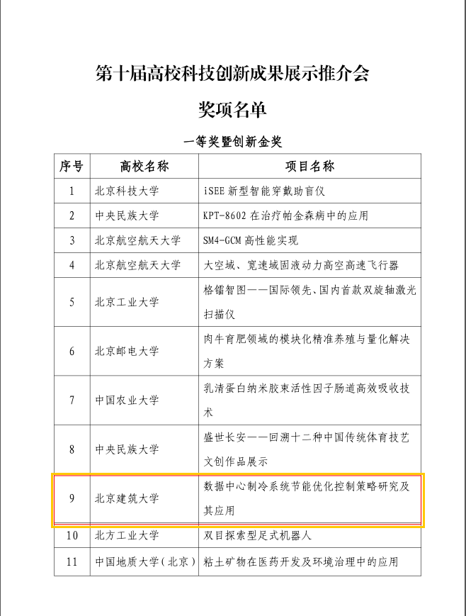 接到推介启动通知后,我校电信学院积极响应,派出队伍与来自京津冀50余所高校的1095支队伍同场竞技。最终,由我校电信学院魏东教授指导的学生创新成果《数据中心制冷系统节能优化控制策略研究及其应用》,历经初评和复评路演,从京津冀各高校110件进入复评的创新成果中脱颖而出,斩获新材料与新能源及节能技术类别的一等奖暨“创新金奖”。(本届推介会共评出11项一等奖)