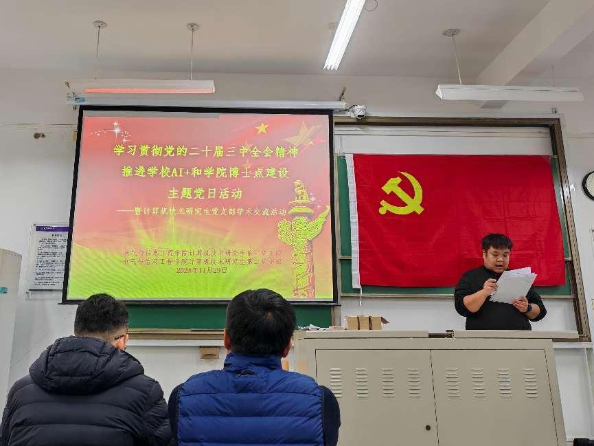 为学习贯彻党的二十届三中全会精神,推进学校AI+和学院博士点建设,计算机技术研究生第一、第二党支部于11月29日联合开展主题党日活动暨计算机技术研究生学术交流活动。活动由第二党支部书记段然主持。学院党委副书记秦岭和组织员丁建峰列席参加本次活动。