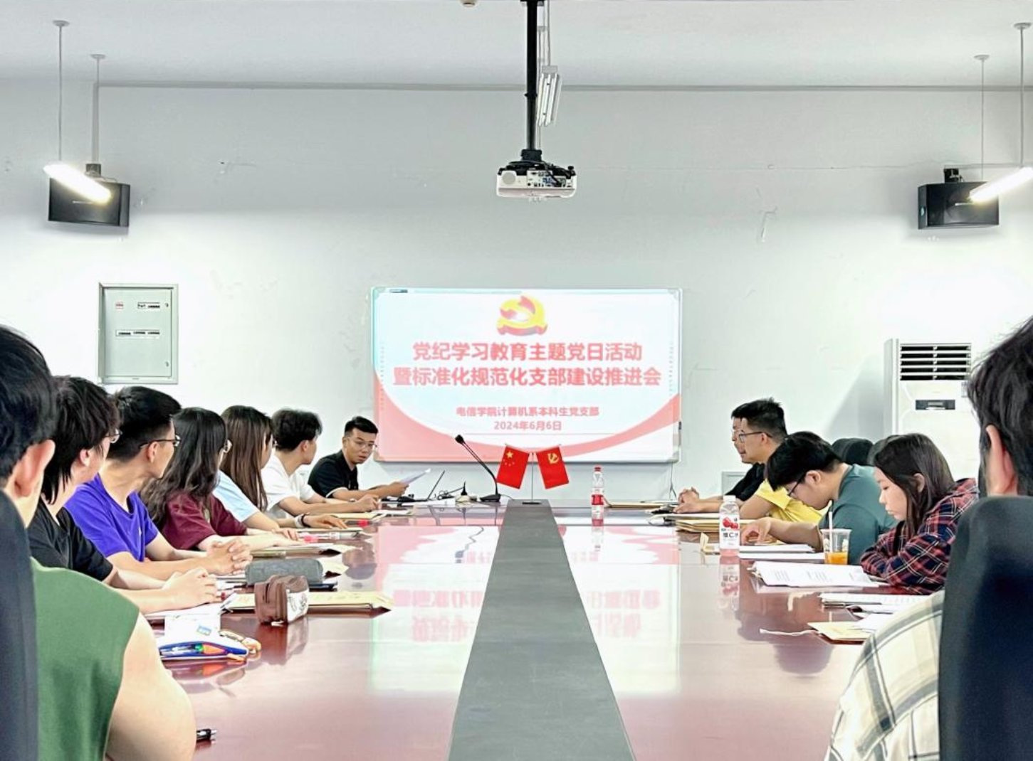 6月6日晚,电信学院计算机系本科生党支部在学D542党员活动之家召开党纪学习教育主题党日活动暨标准化规范化支部建设推进会。支部全体党员、第21期发展对象参加会议,会议由支部书记赵光政主持。