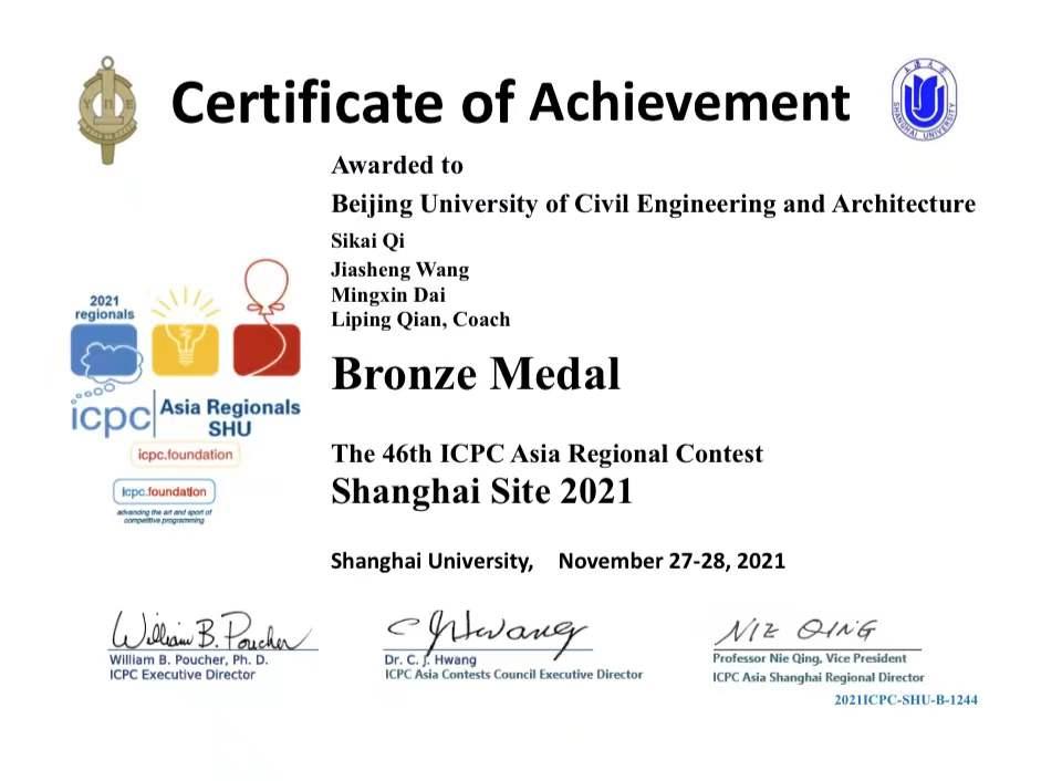 2021年11月29日,第46届ICPC东亚洲区域赛(上海)站正式开赛,共有来自全国256所高校、682支队伍、2046名学生同场竞技,电信学院共派出4支3人团队参赛,最终404 Not Found队伍冲入前120名,斩获亚洲区域赛铜牌。