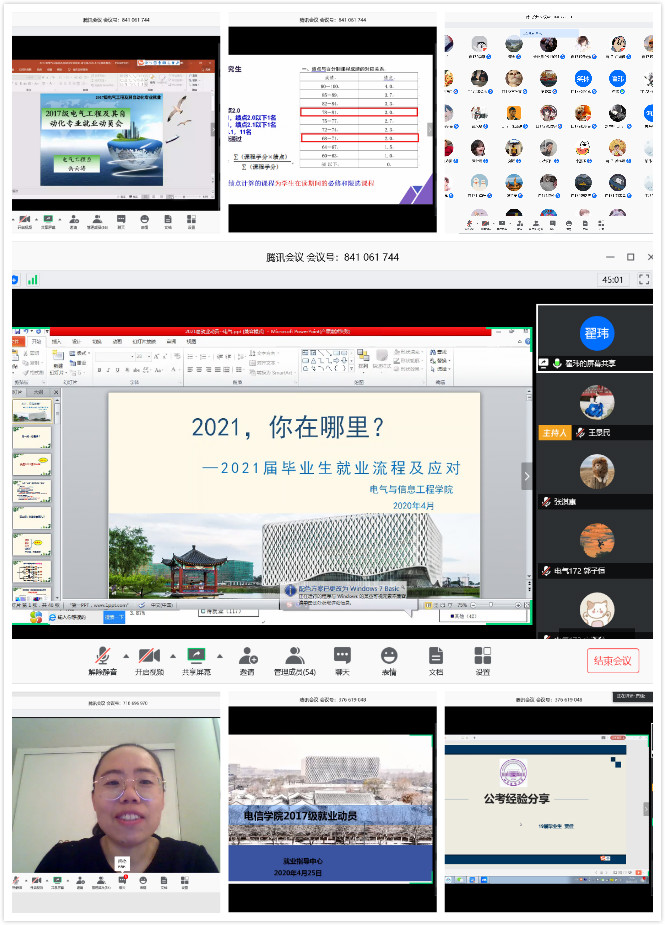 2020年4月,研究生、本科生分专业召开5场就业动员会,学院副书记、各系主任、17级班主任及辅导员到场参会。