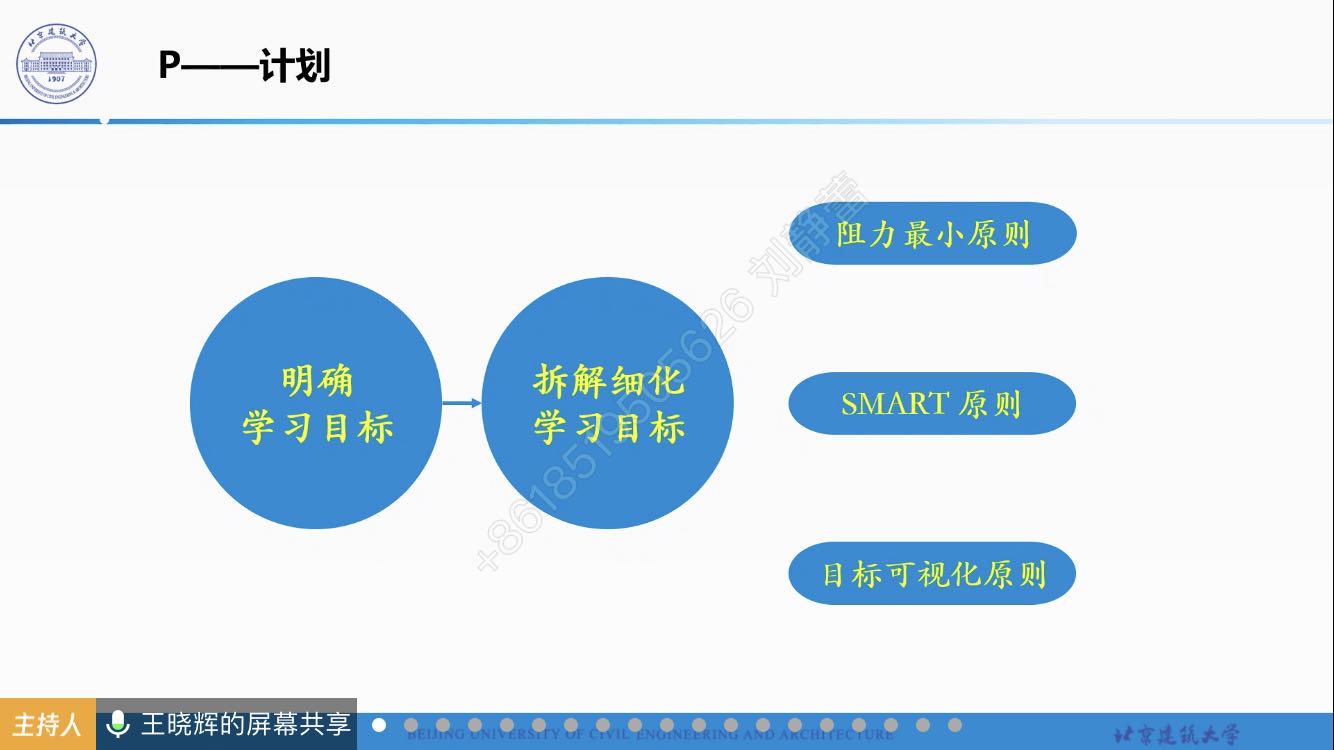第二期讲座王老师针对科研专注力向我们详细介绍了PDCA法:P即plan(计划),指确定方针、目标和活动计划,在明确学习目标时要秉承阻力最小原则、SMART原则与目标可视化原则,将大的学习目标拆解细化为一个个逐步击破的小目标;D即do(执行),指执行计划中的内容;C指(check),指检查/总结执行计划的结果、找出问题;A即adjust/action(处理),指对总结检查的结果进行处理/调整/纠正。此外老师介绍的精力管理方法也对我的假期生活有了十分积极的影响,家中的学习效率有了很大改善。