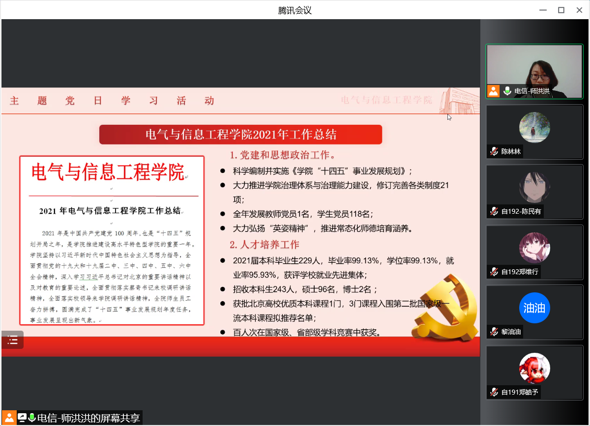 4月2日下午,电信学院退休第一党支部、退休第二党支部、自动化系本科生党支部联合开展主题党日活动,集中学习学校和学院2021年工作总结、2022年工作要点,并进行线上交流。电信学院党委书记吴建国参加线上活动。