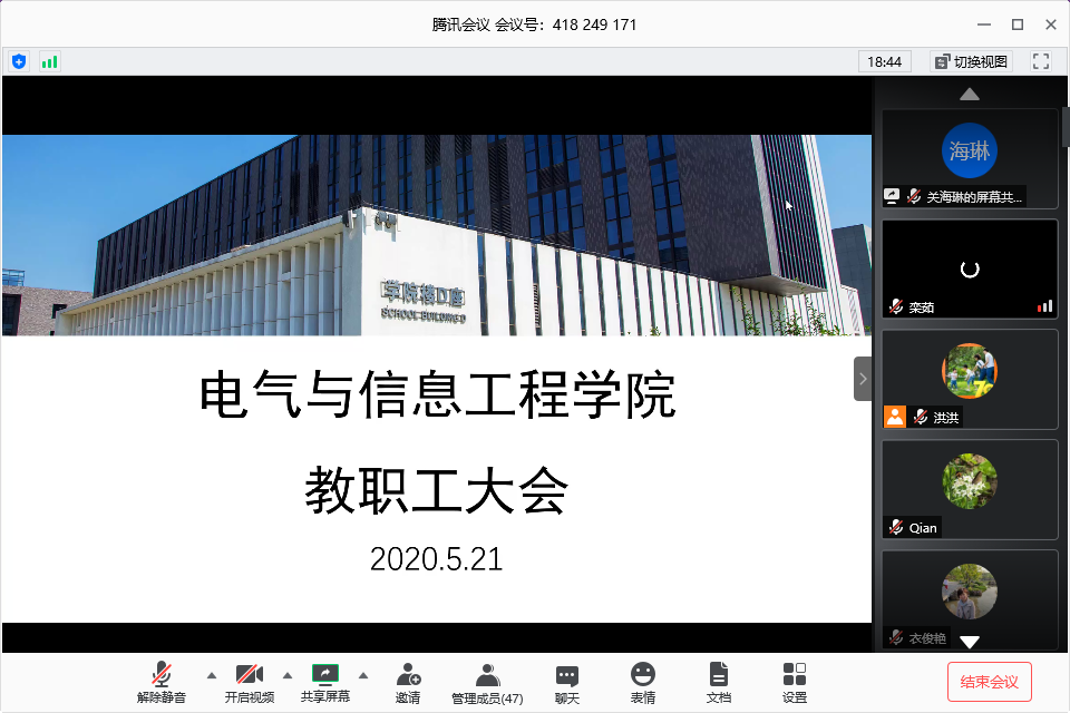 5月21日晚,电信学院通过“腾讯会议”线上召开全体教职工大会,部署近期学院各项重点工作。会议由学院党委书记张雷主持,全体教职工参加。