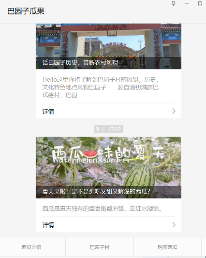 为扎实推进北京市“百村示范”创建工作,全面提高“百村示范”村的示范能力,2022年4月,计算机系师生党支部前往巴园子村座谈调研。调研后,历经一个月的时间,由计算机系部师生开发的“巴园子瓜果”公众号正式上线,帮扶巴园子村的西瓜销售。